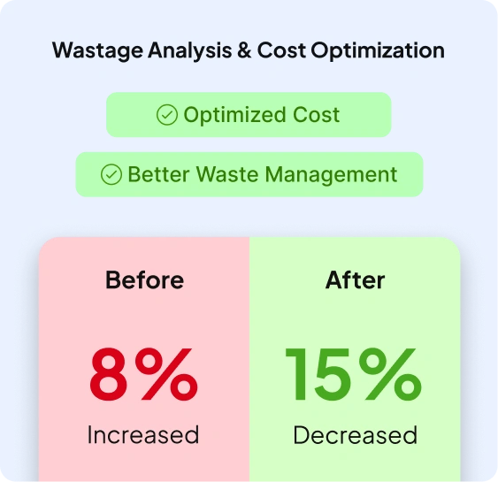 Capture wastage data at every level: item-wise, group-wise and reason-wise to control process losses and improve efficiency.